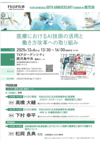 12月6日に開催される 富士フイルム主催 FUJIFILM MEDICAL 60周年記念セミナー にて、松岡理事長が講演いたします。