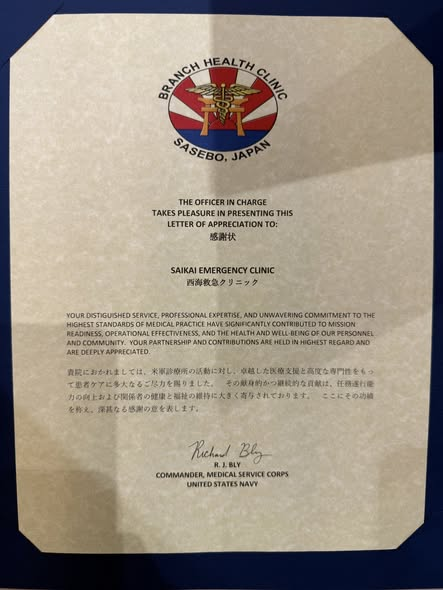 当院が24時間体制で米軍関係者およびそのご家族の健康を守っていることに対し、深い感謝の意が述べられ、感謝状とともに佐世保海軍のワッペンおよびエンブレムを賜りました。